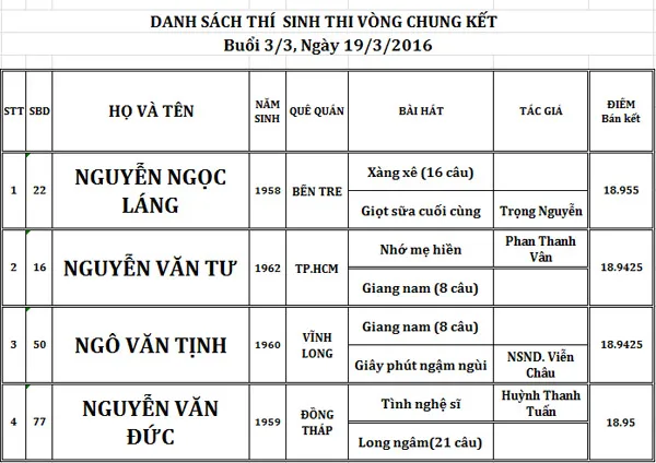 Ban giám khảo của buổi thi gồm có: Thạc sĩ Huỳnh Khải, Soạn giả Minh Thùy, NSƯT Ngọc Mai, Soạn giả Ngô Hồng Khanh và NSƯT Thanh Tuấn. Dẫn chương trình: Thành Bỉ.