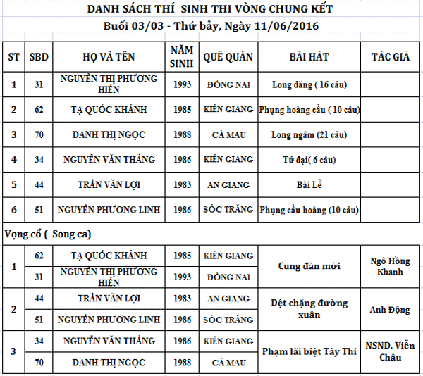 Ban giám khảo buổi thi hôm nay, gồm có: Thạc sĩ Huỳnh Khải, Soạn giả Đăng Minh, NSƯT Thanh Tuấn, NSƯT Lê Tứ và NSƯT Phượng Hằng.