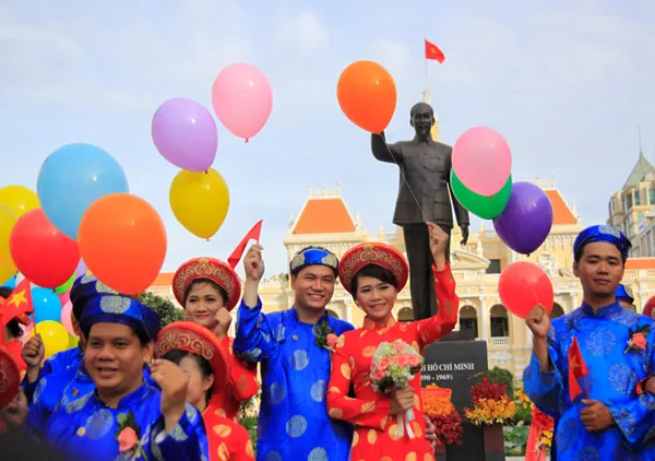 Cũng trong sáng nay, 100 đôi uyên ương là cán bộ công nhân viên, người lao động, người khuyết tật, thanh niên có hoàn cảnh khó khăn đang làm việc tại TPHCM và khu vực lân cận đã đến dâng hoa tại tượng đài Bác Hồ trước khi tổ chức đám cưới tập thể năm 2015.