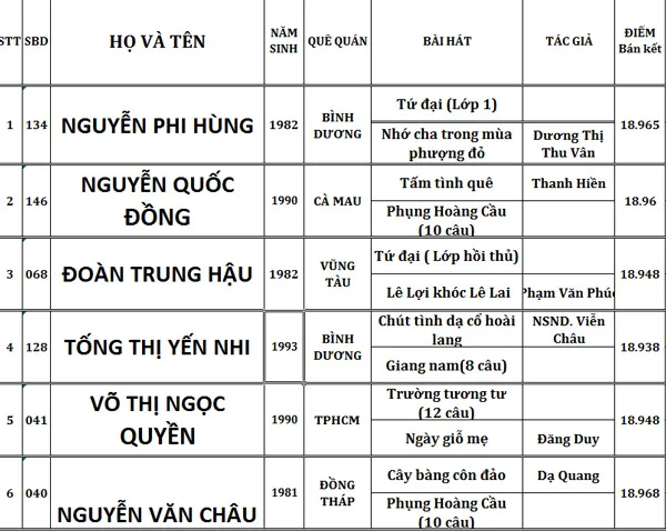 DANH SÁCH THÍ SINH THI VÒNG CHUNG KẾT 01