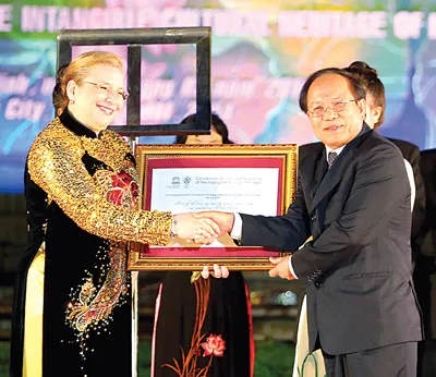 | Bà Katherine Muller Marin, Trưởng đại diện UNESCO tại Việt Nam, trao bằng vinh danh nghệ thuật đờn ca tài tử Nam bộ. Ảnh: SGGP |