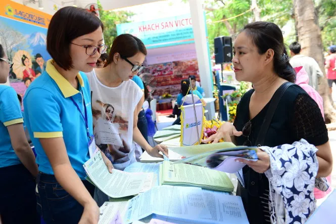Nhân viên Công ty Du lịch Lữ hành Saigontourist tư vấn cho khách về thông tin các chuyến đi du lịch giảm giá trong Ngày hội du lịch TPHCM tại công viên 23/9 trưa 24/3 (Ảnh: Quang Định/TTO)