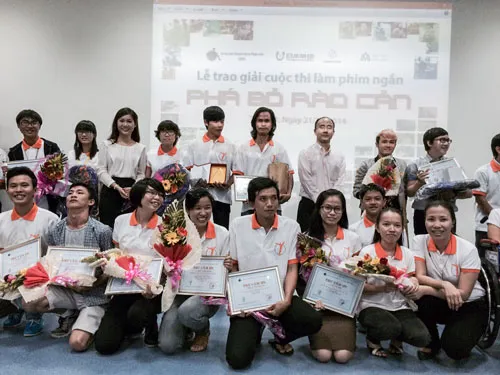 Các nhóm thi đoạt giải chụp ảnh lưu niệm tại Lễ trao giải cuộc thi làm phim ngắn.