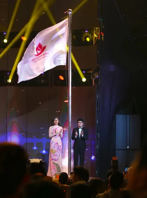 Vân Trang và Trương Minh Quốc Thái kéo cờ khai mạc Liên hoan phim Việt Nam lần thứ 19 - Ảnh: TTO.