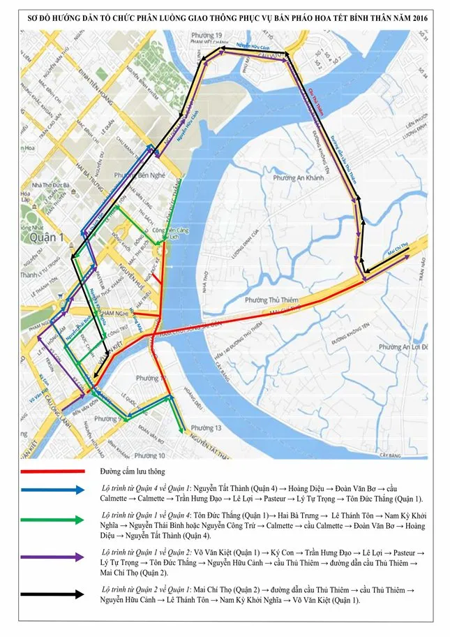 Sở Giao thông Vận tải khuyến cáo người dân khi tham gia lưu thông không được phép dừng đỗ xe hoặc tập trung trên cầu Khánh Hội, cầu Móng, cầu Calmette, cầu Ông Lãnh, cầu Thủ Thiêm, cầu Sài Gòn, cầu Phú Mỹ, các cầu trên tuyến đường Mai Chí Thọ và trên nóc hầm vượt sông Sài Gòn để xem pháo hoa.