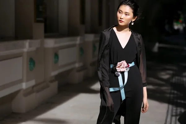 Bộ jumpsuit năng động cũng có thể trở nên dịu dàng khi kết hợp với thắt lưng gắn hoa và áo khoác nhẹ bằng chất liệu voan.