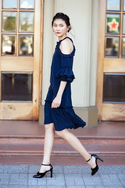 Không chỉ có những bộ trang phục tiện dụng hằng ngày, Kin Concept còn chú trọng vào chi tiết cho những thiết kế đi tiệc. Kiểu đầm trễ vai đang thịnh hành được điểm xuyết những chi tiết xếp nhún vải vô cùng nữ tính và dịu dàng