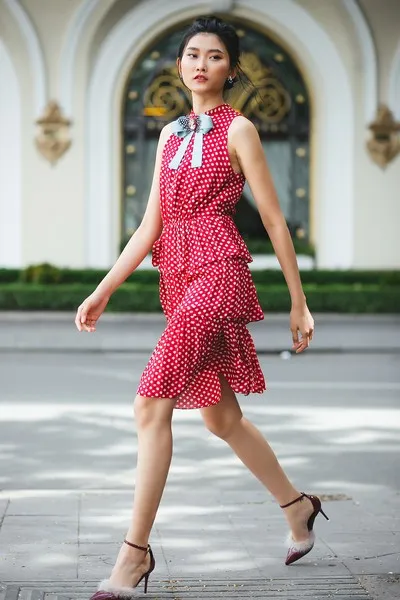 Chiếc đầm ba tầng vải xếp nhún thướt tha mang lại sự duyên dáng và sang trọng. Đây cũng là thiết kế của Kin Concept được khách hàng yêu thích nhất