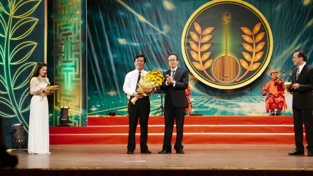 Ông Lê Công Đồng - Giám đốc Đài Tiếng nói Nhân dân TPHCM (VOH) tặng hoa cho nhà tài trợ Công ty Cổ phần Phân bón Bình Điền – Thương hiệu Đầu Trâu (Ảnh: Khiêm Huân)