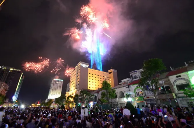 Hàng ngàn người dân xem pháo hoa tại Quảng trường đi bộ Nguyễn Huệ (ảnh: TNO)
