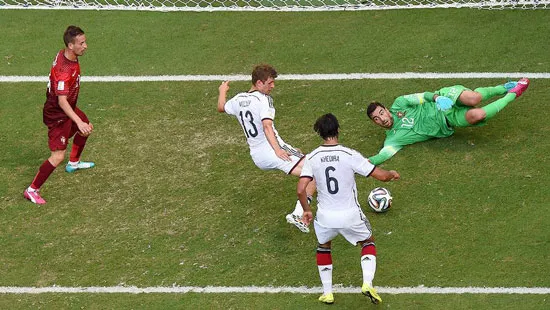 Dẫn trước 2 bàn và chơi hơn 1 người nên chiến thắng chắc chắn sẽ khó vuột khỏi tay thầy trò HLV Joachim Loew. Dù vậy, có vẻ họ vẫn chưa muốn dừng lại với tỷ số 2-0 khi bước vào giờ giải lao. Phút 45, Kroos chuyền bóng thẳng vào khu cấm, hai hậu vệ Bồ Đào Nha đã thất bại trong việc kèm Mueller và vua phá lưới World Cup 2010 ra chân rất nhanh buộc thủ môn Patricio vào lưới nhặt bóng thêm 1 lần nữa. Và 3-0 là tỷ số của 45 phút đầu tiên.