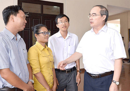 Bí thư Thành ủy TPHCM Nguyễn Thiện Nhân trao đổi cùng cán bộ trẻ trong buổi gặp gỡ cán bộ nguồn quy hoạch. Ảnh: SGGP