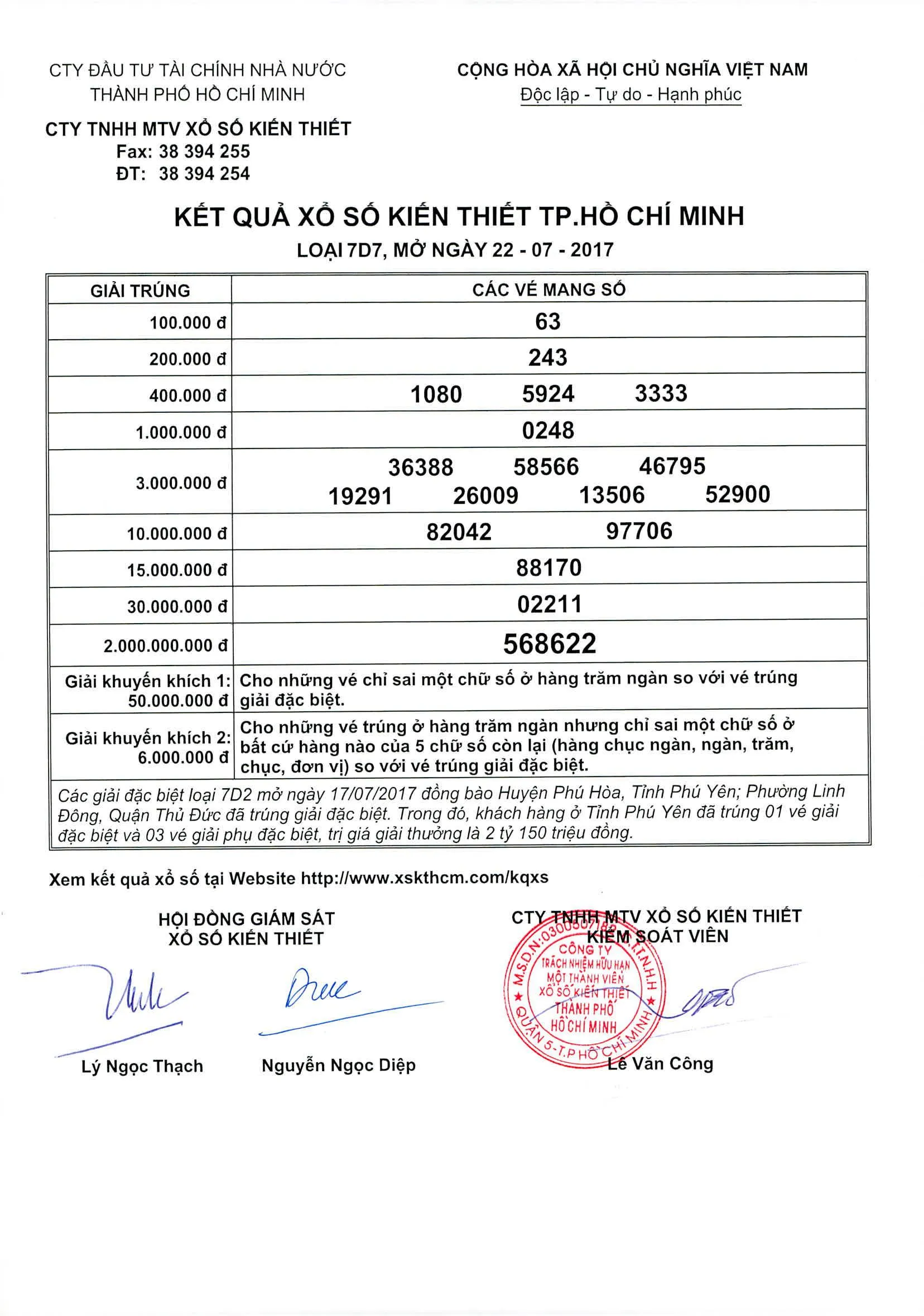 (VOH) - Kết quả xổ số Kiến thiết Thành phố Hồ Chí Minh, loại 7D7 mở ngày thứ bảy, ngày 22/07/2017. Kqsxkết quả xổ số TPHCM