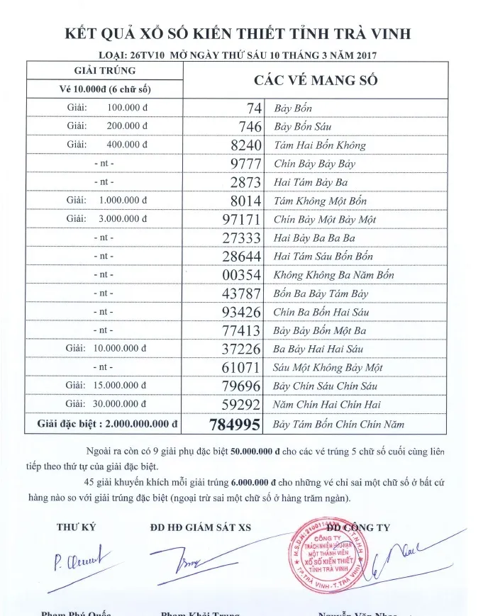 (VOH) - Kết quả xổ số Kiến thiết tỉnh Trà Vinh Loại 26TV10 mở ngày thứ Sáu, 10/03/2017. vé sốKQXSKết quả xổ số tỉnh Trà Vinh