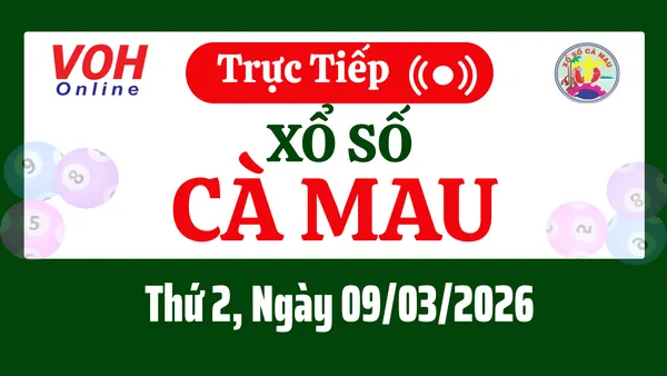 Xổ số Cà Mau hôm nay 9/3/2026 được cập nhật trực tiếp lúc 16h10 từ trường quay.